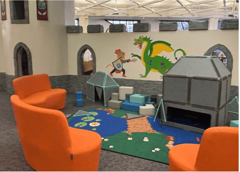 - New additions: One of the most popular improvements made possible by funds from the Friends are these huge, kid-sized magnetic building tiles in front of the Children’s Area. The bright orange seating was also purchased with money raised by our Book Sale and your membership dues, thank you! The graphic of Sneaks battling a dragon promotes the castle theme that’s unique to our branch.