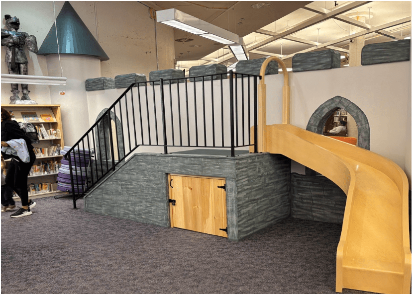 Perhaps the most popular new addition to the Children’s Section is the sturdy wooden slide that is positioned on the inside of the castle wall, facing the picture book shelves. Preschoolers are loving it! We’ll be featuring other upgrades made possible by the Friends of the Towson Library in future newsletters.